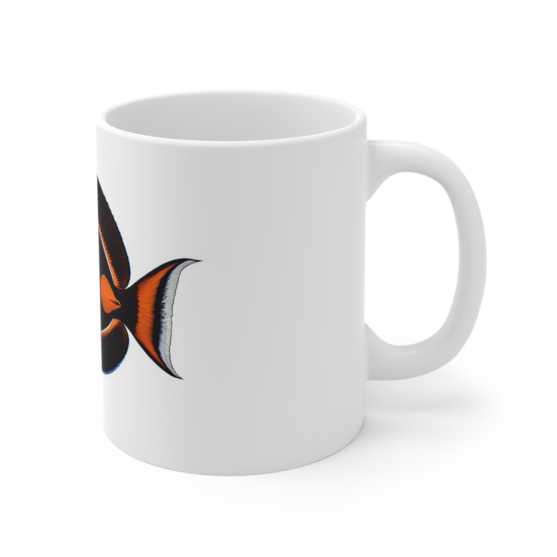 This white ceramic mug brings a quiet, underwater calm to morning routines. A richly detailed tropical fish—deep charcoal with burnt-orange accents—glides across the glossy surface, inviting a moment of slow breathing and daydreaming of reef dives. The comfortable C-handle and rounded silhouette fit naturally in hand, while the compact 11oz size keeps the focus on a single perfect cup of coffee or tea. It slips into daily life easily: a companion on the desk during sketching sessions, a steady presence at the windowsill while watching rain, or a thoughtful token for someone who loves marine life.